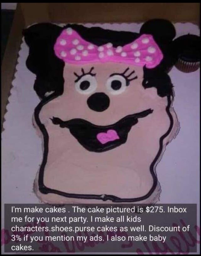 "Я делаю торты. Торт на снимке стоит 275 долларов. Сделайте у меня заказ для вашего следующего праздника. Я могу изготовить торты с любыми персонажами, в виде туфель, сумок. Дарю 3% скидку, если вы сделаете репост моей рекламы. Я также делаю торты на первый годик"