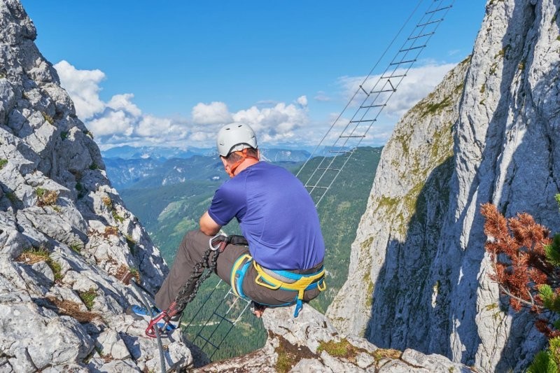 Как сказано на туристическом сайте региона Дахштайн, подъем относится к категории via ferrata, т.е. участок оборудован стальными тросами, перекладинами, колышками и лестницами, к которым альпинисты крепятся с помощью страховочных ремней.