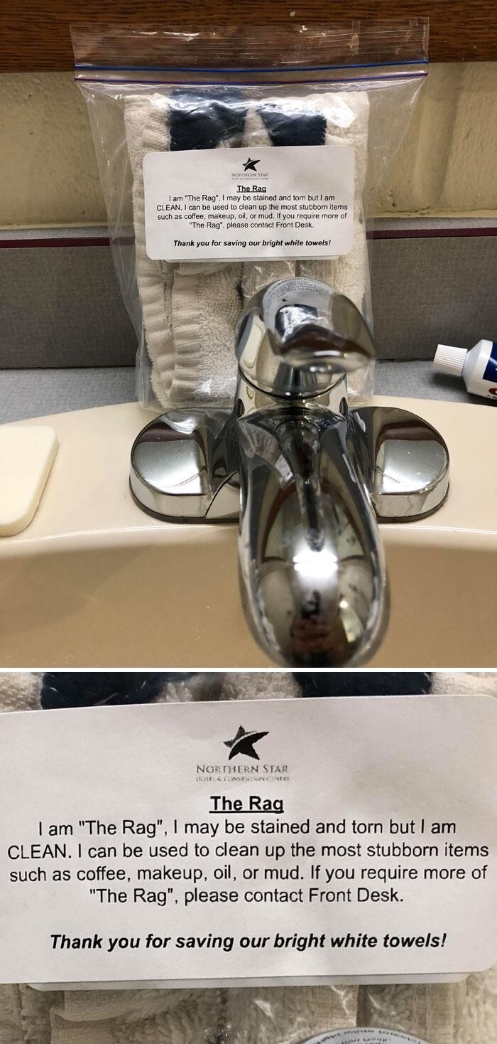 «Я Тряпка, и я могу быть вся в пятнах или дырках, но я ЧИСТАЯ. Мною можно вытирать пятна от кофе, масло, грязь, даже снимать макияж. Если вам понадобится больше тряпок, сообщите об этом администратору. Спасибо за то, что помогает сохранить в чистоте наши белоснежные полотенца для лица и тела!»