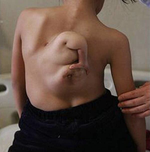 Это редкая аномалия (и тип тератомы), при которой один из близнецов продолжает нормально развиваться, а другой перестает развиваться, и часть его тела остается в теле первого близнеца. Обычно лишние части удаляют гораздо ближе к рождению жизнеспособного ребенка, но вот как это выглядит у ребенка постарше.