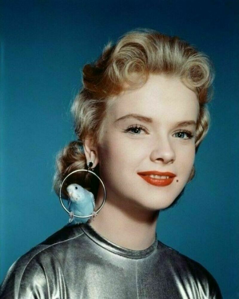 Актриса Энн Фрэнсис в фильме «Запретная планета» в серьгах, в которых сидят настоящие попугайчики