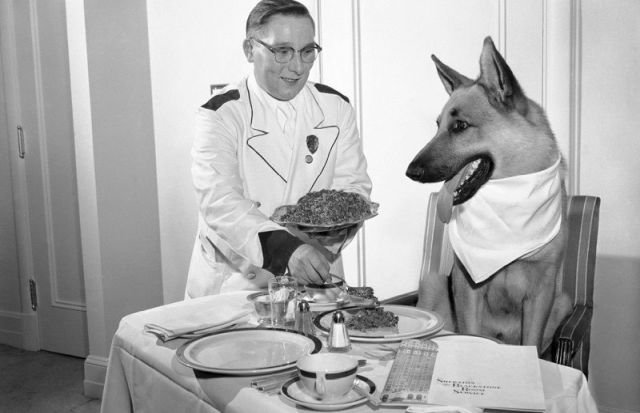 Голливудская звезда овчарка Рин Тин Тин обедает в своем номере отеля "Sheraton". Чикаго, 1956 год.