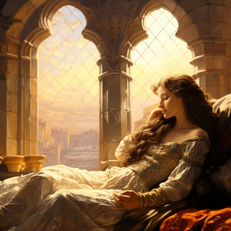 Принцесса Талия росла и как-то раз, гуляя, она наткнулась на старуху, что пряла у себя в доме. Девушка решила помочь и случайно загнала себе под ноготь льняное семечко. Талия рухнула замертво и оглушённый горем отец нарядил доченьку во всё самое красивое, посадил в кресло и покинул дворец навсегда.