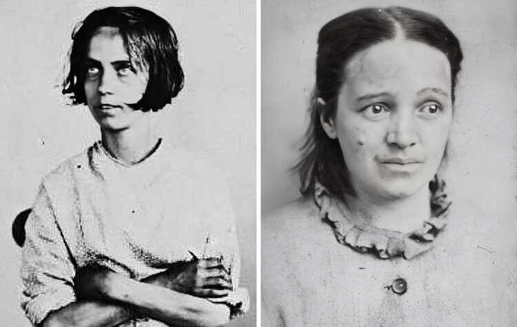 На фотографии слева можно видеть Гарриет Джордан, госпитализированную в 1858 году с диагнозом острая мания, а на правом фото — неизвестная женщина, страдающая острой меланхолией.