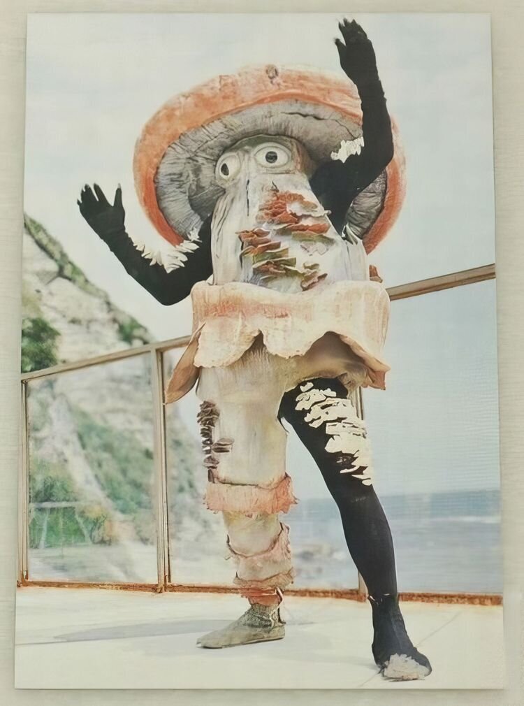 Необычным образом сконструированный костюм придавал ногам клоуна нереалистично круглый вид, а ботинки в виде босых ног дополняли общую картину