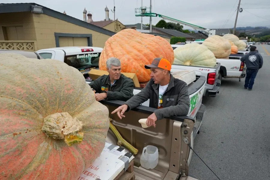 Брайан Вернер, справа, из Гридли, Калифорния, рассказывает о своей тыкве