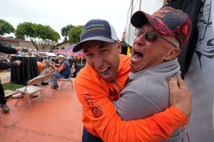 Реакция Трэвиса Джингера из Аноки, штат Миннесота, на победу в 50-м ежегодном чемпионате мира по взвешиванию тыкв в Халф-Мун-Бэй, Калифорния, понедельник, 9 октября 2023 года