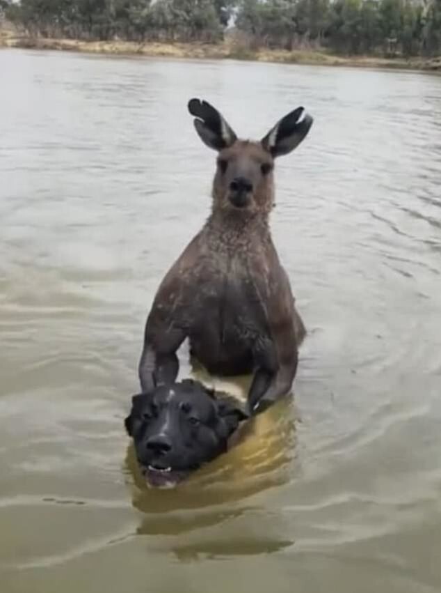 На видео, озаглавленном "Боевые искусства подходят всем, даже кенгуру", сумчатое удерживает собаку в воде.
