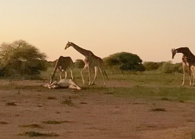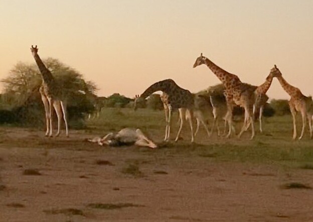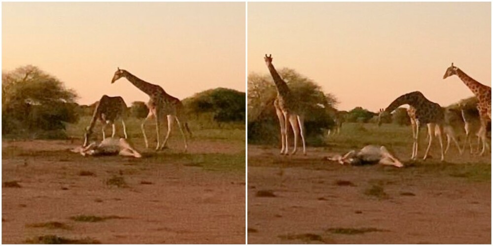 На кадрах видно, что умершую самку окружили пять жирафов. Некоторые из них подошли и сделали прощальный "поклон" в знак своей скорби. Кстати, учёные уже доказали, что жирафы - одни из немногих животных, которые скорбят по погибшим сородичам.
