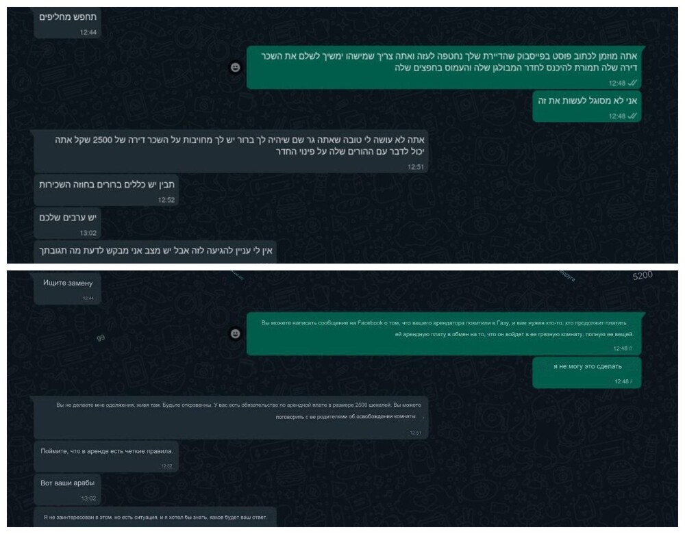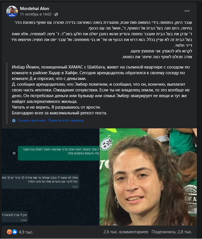 Однако эта история была бы одной из многих, если бы не один нюанс. Недавно соседка по квартире получила сообщение от хозяина жилья Аарона Рейсса с требованием оплатить аренду. Подруга Инбар рассказала владельцу квартиры о трагических обстоятельствах и попросила отсрочку, на что получила ответ: либо отдавай всю сумму за себя и за соседку - 2500 шекелей (примерно 600 долларов), либо ищи себе другую компаньонку.