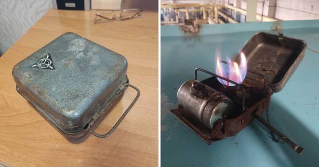 Откапал в куче металлолома примус ПТ-1. Он целый и работает, не хватает кожуха, который защищает бак от перегрева.