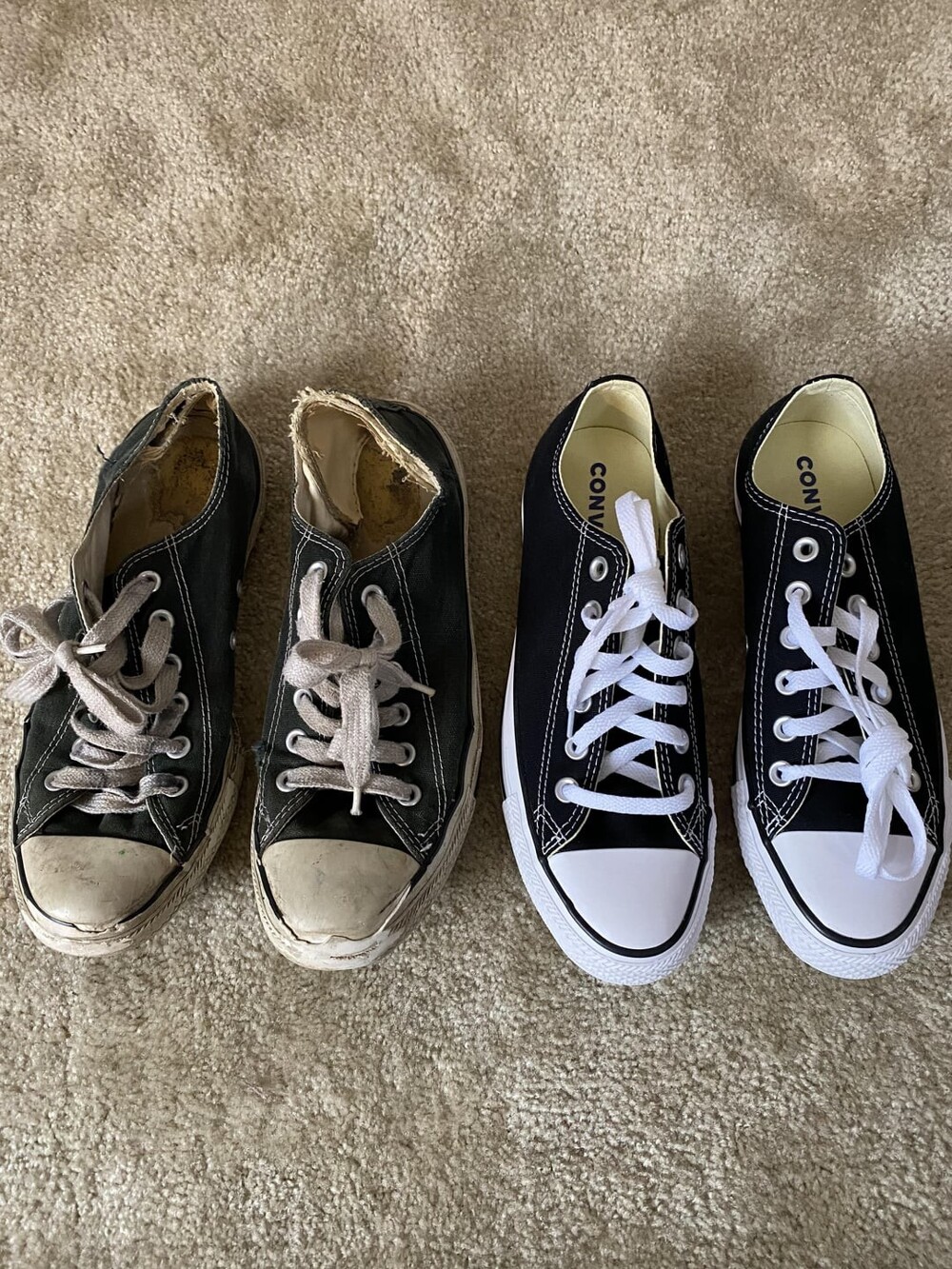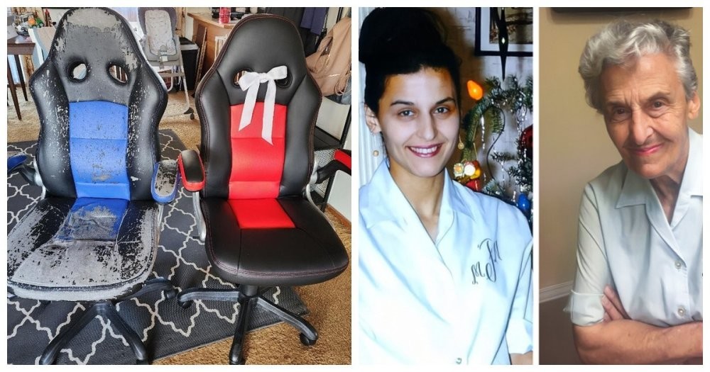 15. Компьютерное кресло моего мужа десятилетней давности в сравнении с новым креслом той же модели, которым я удивлю его сегодня вечером