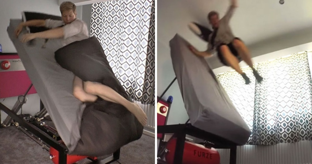 Эта единственная в своём роде кровать с пневматическим механизмом, который быстро перемещает матрас вперёд, отправляя спящего в полет.