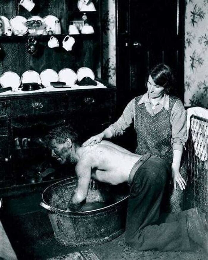 31. Женщина моет над тазом своего мужа-шахтёра, Уэльс, 1931 год