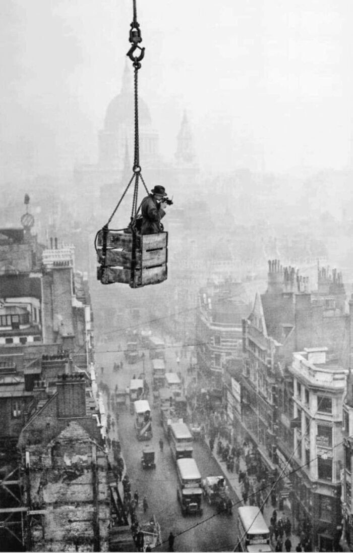 38. Фотограф снимает улицы Лондона из люльки, подвешенной к строительному крану