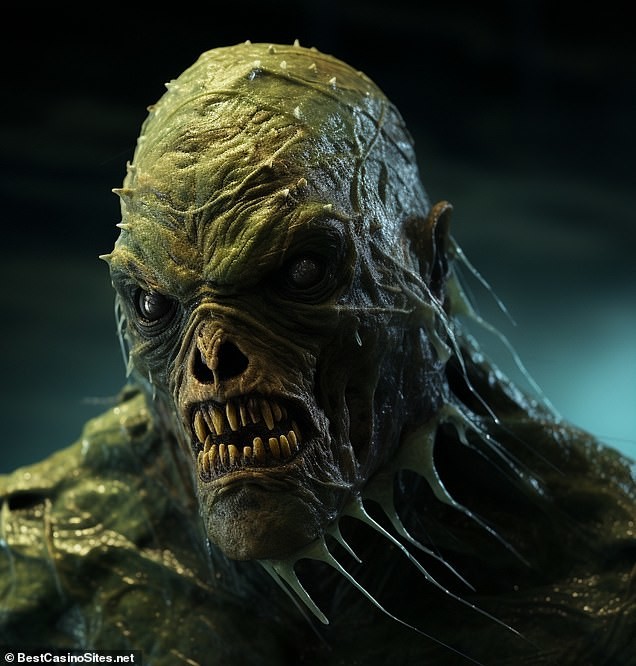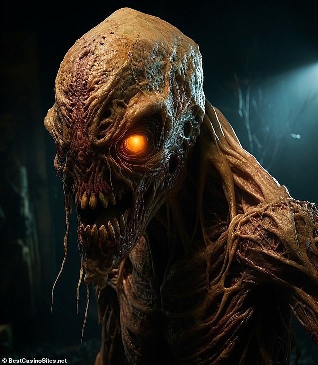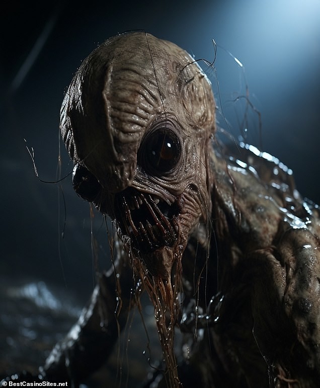 ИИ переработал этот образ, сделав монстра более жутким и похожим на инопланетянина, с большой головой и крупными черными глазами.