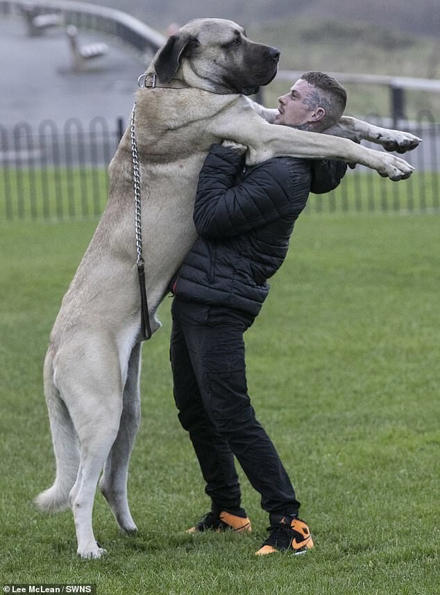 Пёс породы аксарайский малаклы, рост которого составляет чуть больше двух метров, признан самой высокой собакой Великобритании. Он весит как слонёнок и съедает 3 кг мяса в день. На рацион этого хорошего мальчика у хозяина уходит целое состояние. При этом — несмотря на размер, у него очень мягкий характер.