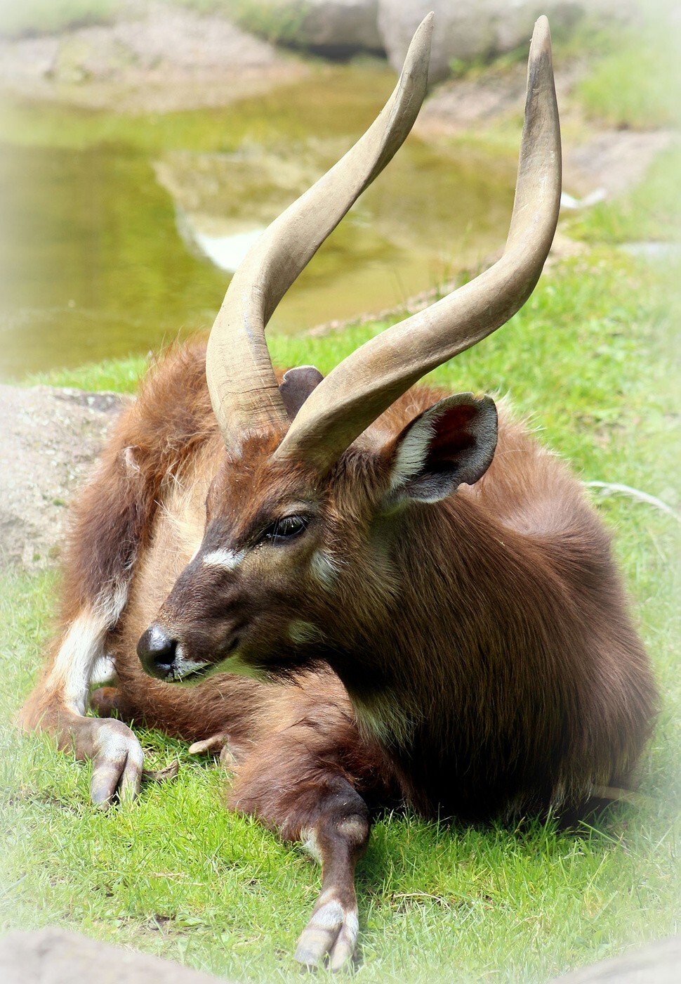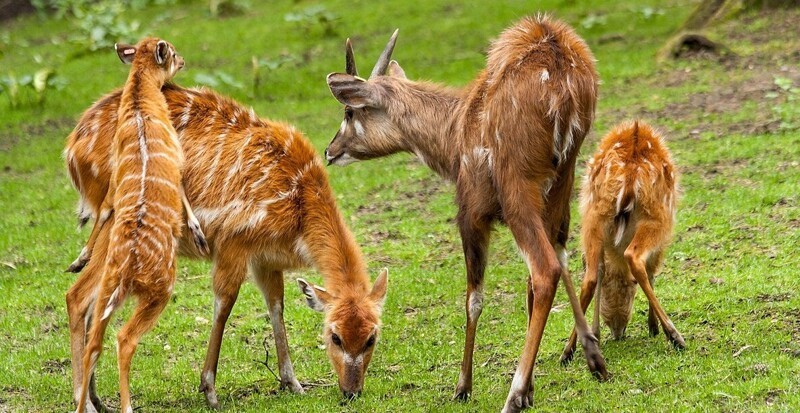 К вопросу о нём. Почему же эти симпатичные создания выбрали для проживания странный ареал – болотистую местность? Ситатунга не только бродит по воде в поисках пищи, но и спокойно может в ней лежать. Для этого животное самостоятельно готовит своего рода подушки-подстилки из травы. И, хорошо их утрамбовав копытами, устраивается поудобнее и методично пережёвывает траву.