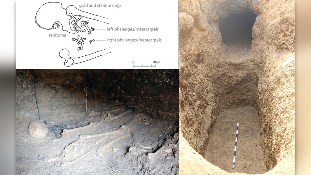 Могила № 3 кладбища Северной пустыни в Амарне, Египет. Справа: шахта на фоне северной камеры. Внизу слева: погребенный 3051, крайний слева. Вверху слева: прорисовка области таза индивида 3051, показывающая расположение тератомы и колец на пальцах.