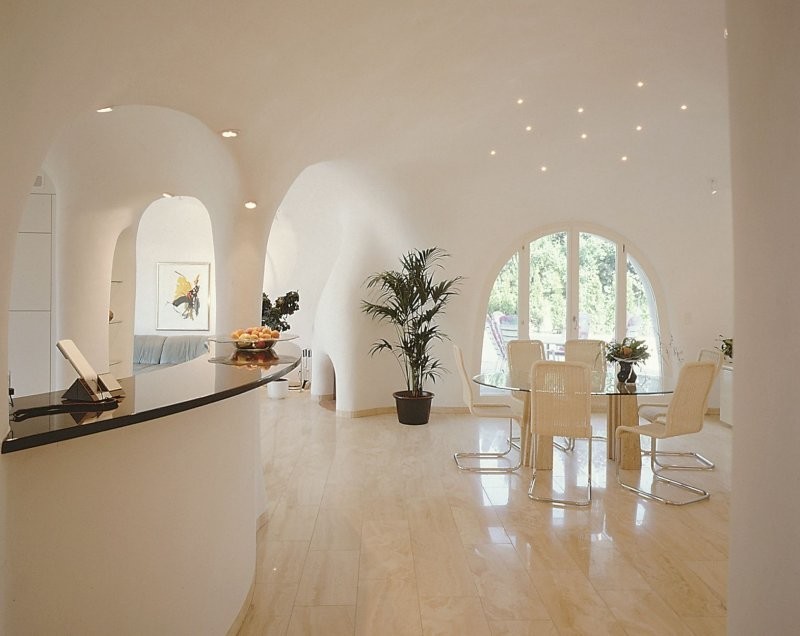 Земляной слой не только обеспечивает комфортный микроклимат и придаёт завершённость, но и подходит для дополнительного озеленения. Внутри домиков нет острых углов и линий. Всё максимально скруглено и сглажено, что придаёт им особую естественную прелесть и самобытность и делает приятным местом отдыха для любителей экотуризма.
