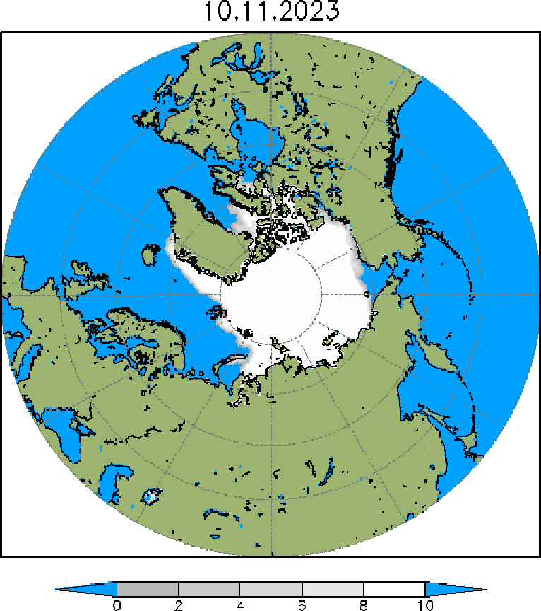 Сплоченность льда представлена в баллах (0 - чистая вода, 10 - сплошной лед). Поля обновляются еженедельно по понедельникам.