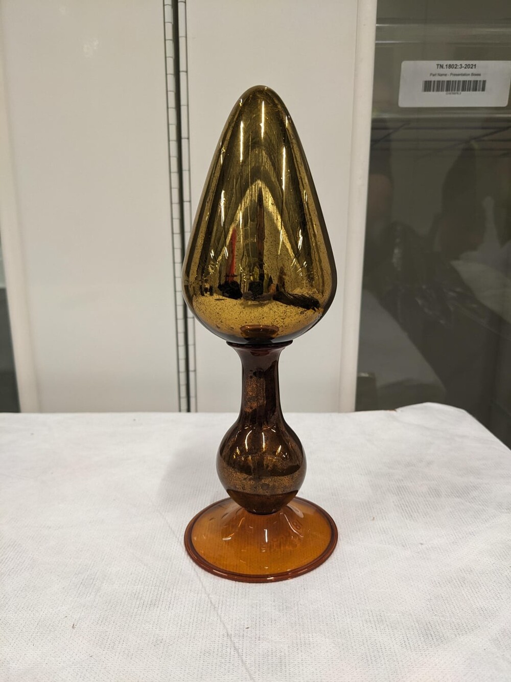 8. Предмет из матового стекла золотистого цвета высотой около 25 сантиметров. Полый без отверстий