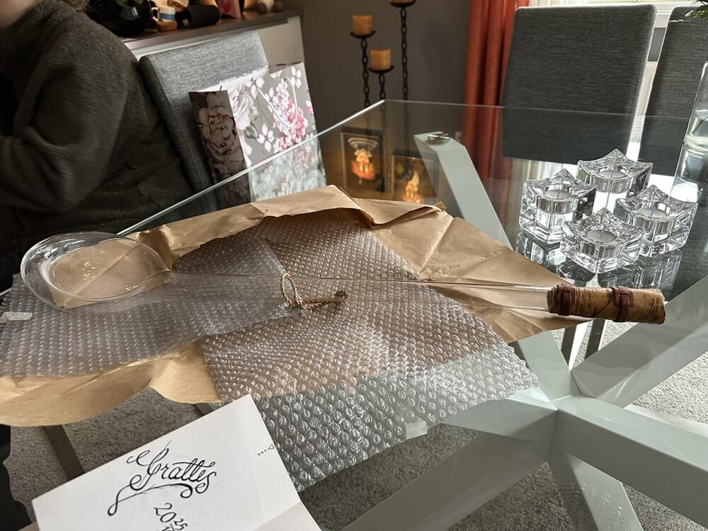 12. Унаследовал эту вещь от родственников скандинавского происхождения. Сделана из стекла, в форме ложки, полая, высотой около 1 метра