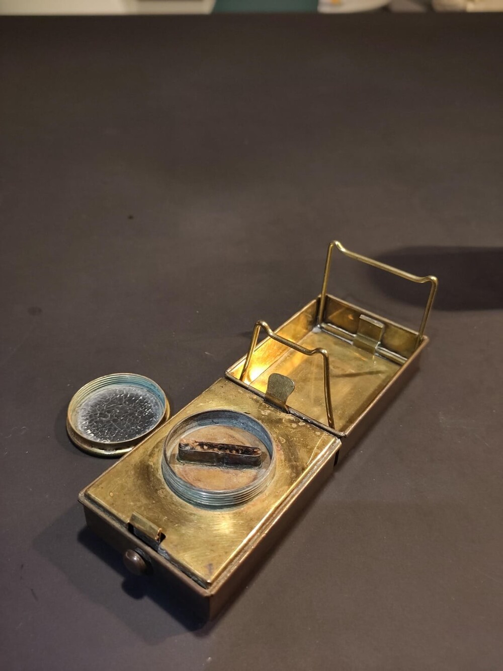 7. Я нашла это среди вещей бабушки. Это медная коробочка без видимых надписей. Там есть подпружиненная кнопка спереди, две складные подставки внутри и фитиль с отделением под ним