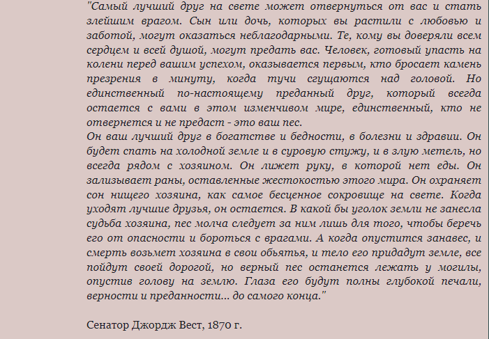 Юрист сдержал слово и выиграл дело. На лужайке у здания суда в Уорренсбурге установили статую, посвятив её Старому Барабану. На постаменте высечена та самая речь. А защитник пса стал известен во всей стране и неоднократно избирался в Сенат. Речь, прославившая Веста, остаётся одним из лучших произведений ораторского искусства в юриспруденции. И, самое главное, это правда.