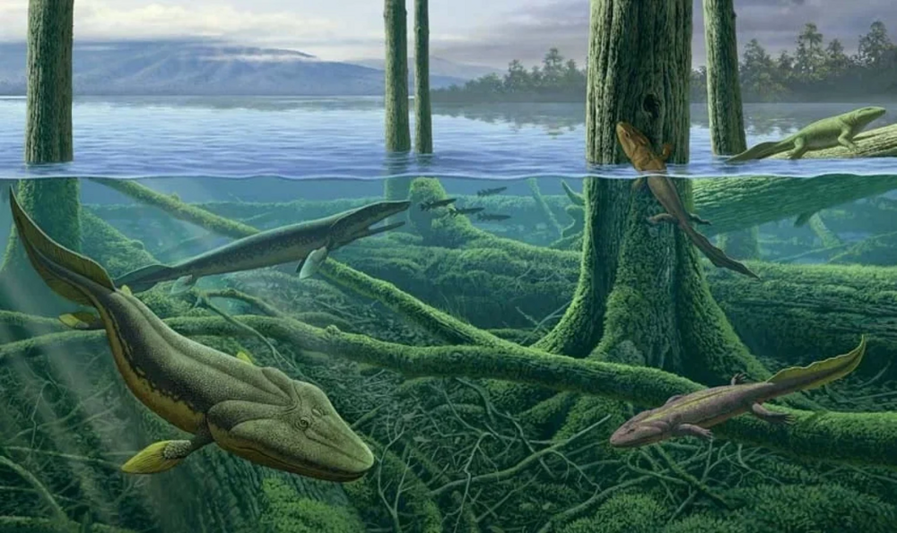 Наших героев обнаружили в Северной Канаде. В девонском периоде она находилась почти на экваторе. В те времена местные равнины представляли что-то среднее между речными долинами, болотами и густыми тропическими лесами. Гниющие листья поглощали из воды кислород, завалы мёртвых древовидных папоротников и плаунов создавали запруды и плотины. Обилие дармовой органики привлекало сюда массу животных всех типов строения.