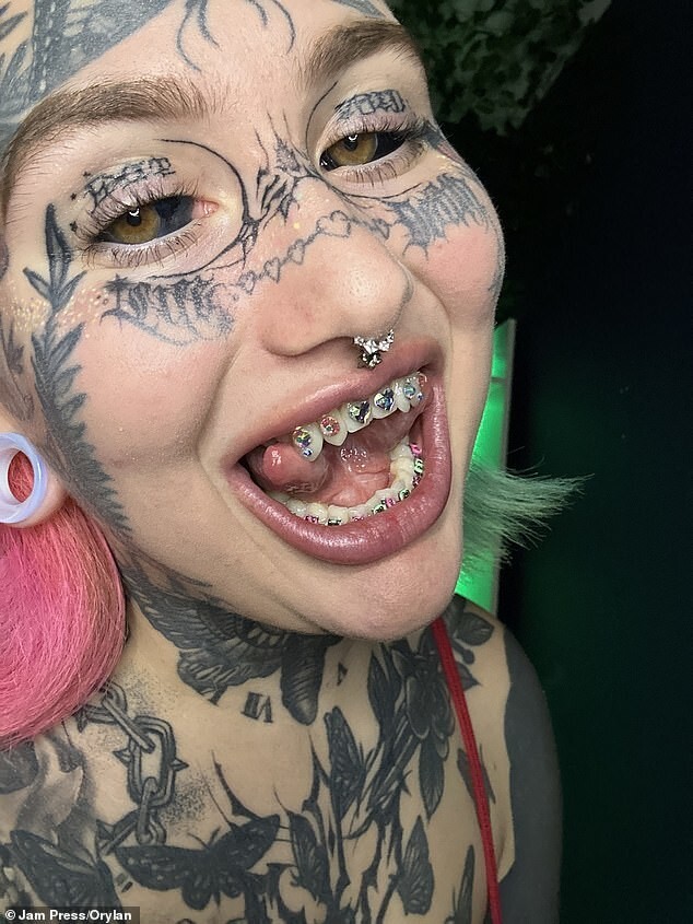 Орилан начала в 14 лет с высветления волос и нескольких татуировок. Дальше — больше. Вскоре она покрыла татуировками большую часть тела, окрасив черными чернилами даже белки глаз. Позже к этому добавился пирсинг, разноцветные стразы на зубах, разрезанный пополам язык, грудные импланты, липосакция, виниры-клыки, имплант в форме сердца в руку...