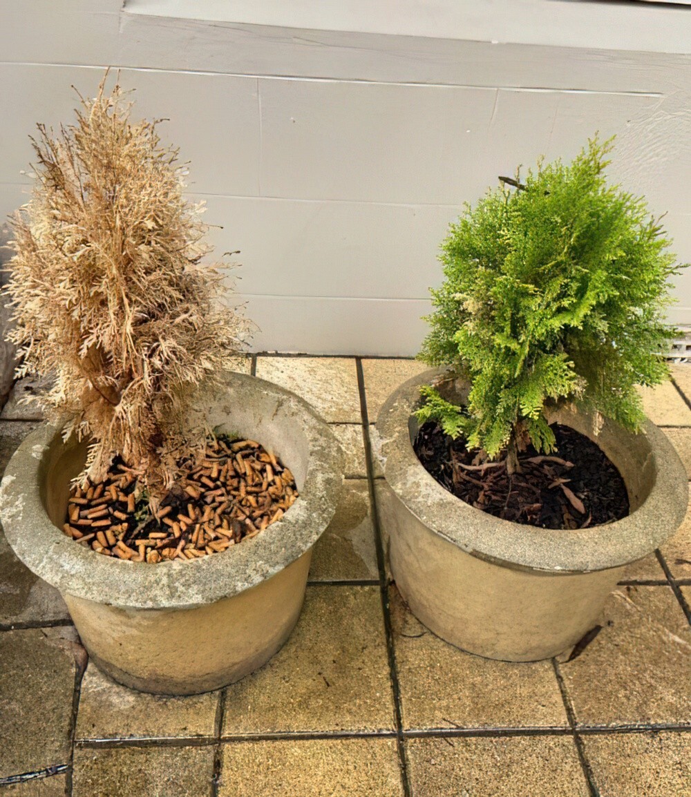 7. «Одинаковые растения и горшки, только один сверху засыпан окурками»