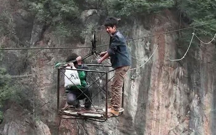 Чтобы попасть в школу, дети и их родители используют самодельную канатную дорогу. Они летят в металлической коробке над пропастью. Альтернатива? Есть: всего-то пять часов в одну сторону, чтобы прийти на уроки. Конечно же все предпочитают опасный полёт.
