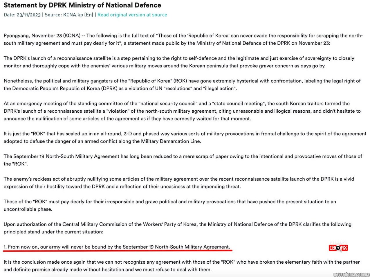 - КНДР разорвала пятилетнее соглашение с Южной Кореей, которое действовало с 2018 года и должно было уменьшить военную напряженность между странами.