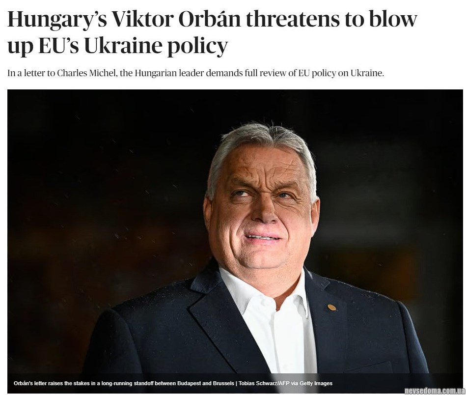 - Виктор Орбан из Венгрии угрожает подорвать политику ЕС в отношении Украины, сообщает Politico.