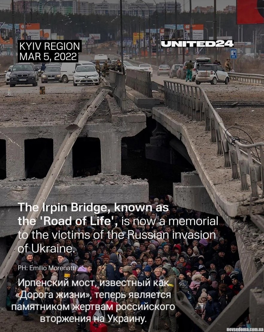 - Сегодня в Киевской области открыли мост через реку Ирпень. 25 февраля 2022 г. ВСУ взорвали мост, чтобы помешать атаке россиян. В марте через мост эвакуировались тысячи мирных жителей