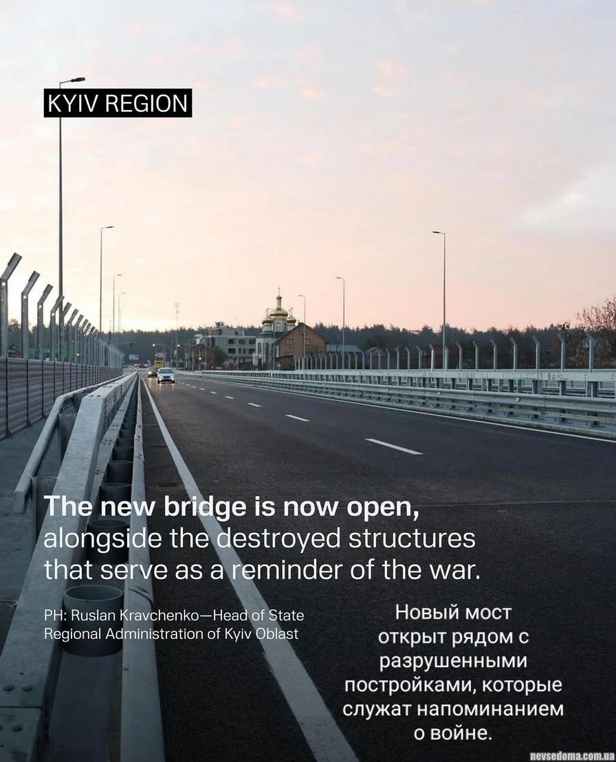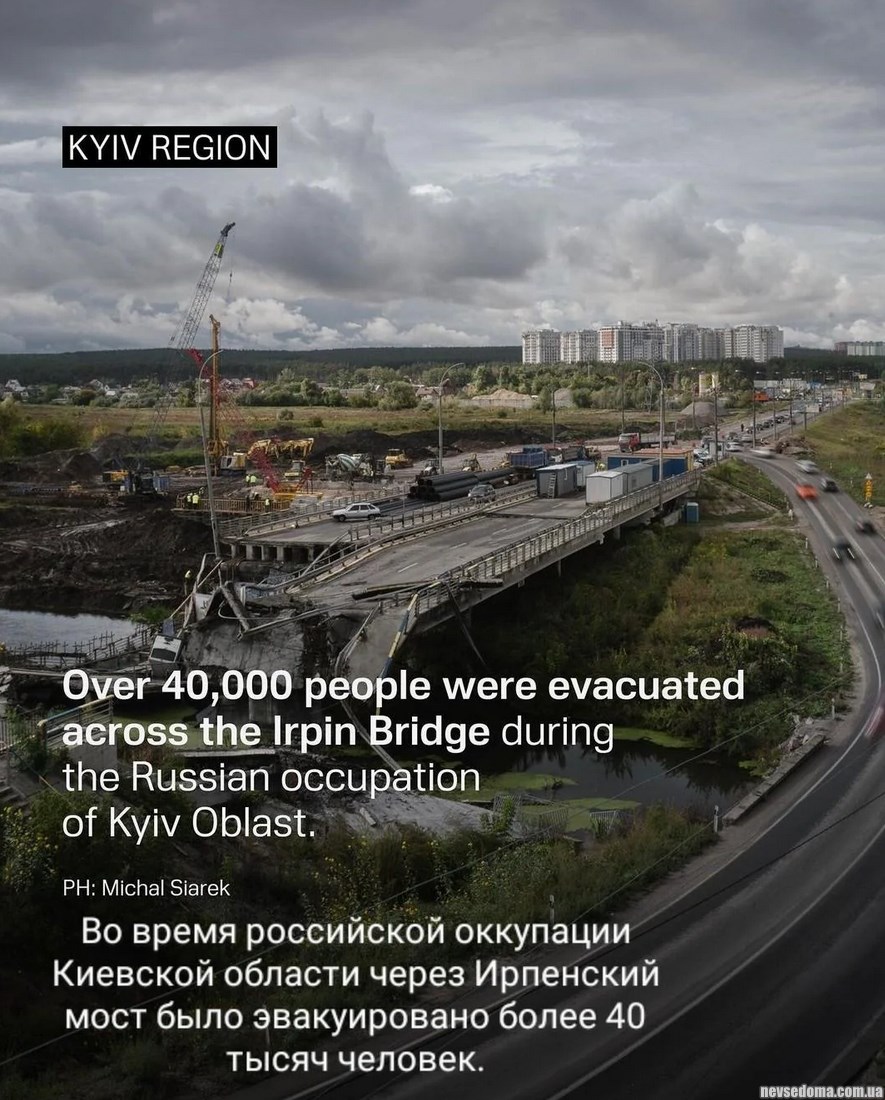 Сегодня открылся мост через реку Ирпень в селе Романовка, Киевской области. Рядом остатки разрушенных построек стоят как памятник войне. 25 февраля 2022 года Силы Обороны Украины намеренно взорвали мост, чтобы предотвратить возможные атаки России на Киев. В марте именно этот мост послужил важным путем эвакуации тысяч людей.