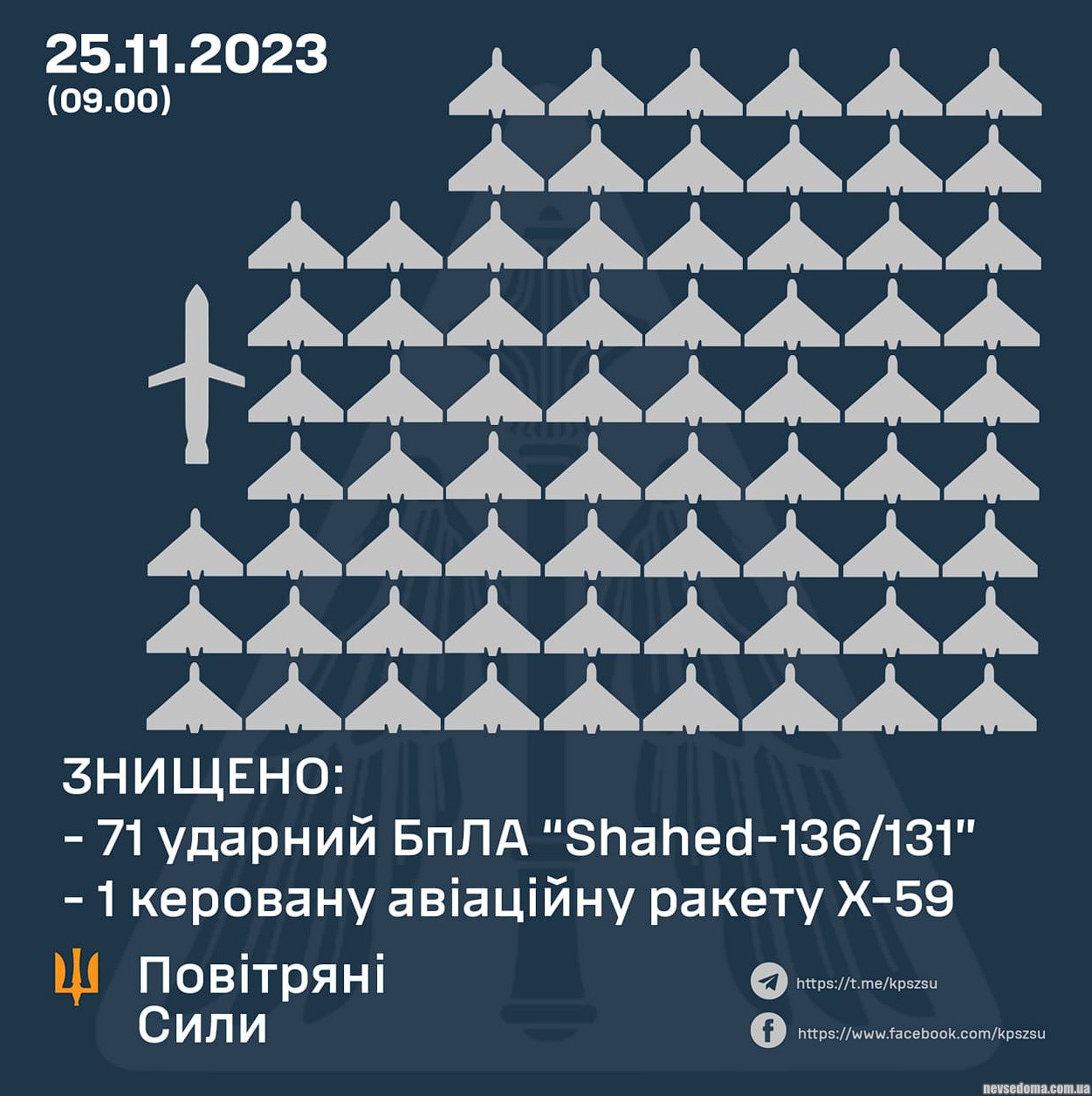 71 из 75 шахедов уничтожены над Украиной ночью, - ПС.