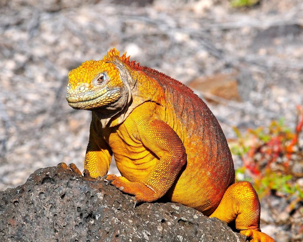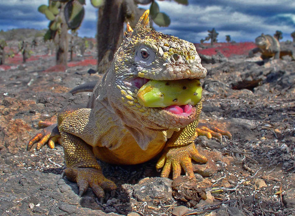 Дорожки морских и сухопутных игуан разошлись 8-10 миллионов лет назад. Родственные связи за столь приличный срок животины не растеряли. Что наземные, что водоплавающие игуаны сохранили примерно одинаковые размеры тела: 10-13 кг живого веса, метр-полтора в длину, половина которых приходится на хвост. От диеты на одних кактусах игуаны аж пожелтели. Буквально: основа рациона рептилий — кактус-опунция, в которой полно красителей беталаинов. Вот ящер и залился желтой краской.