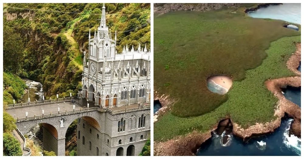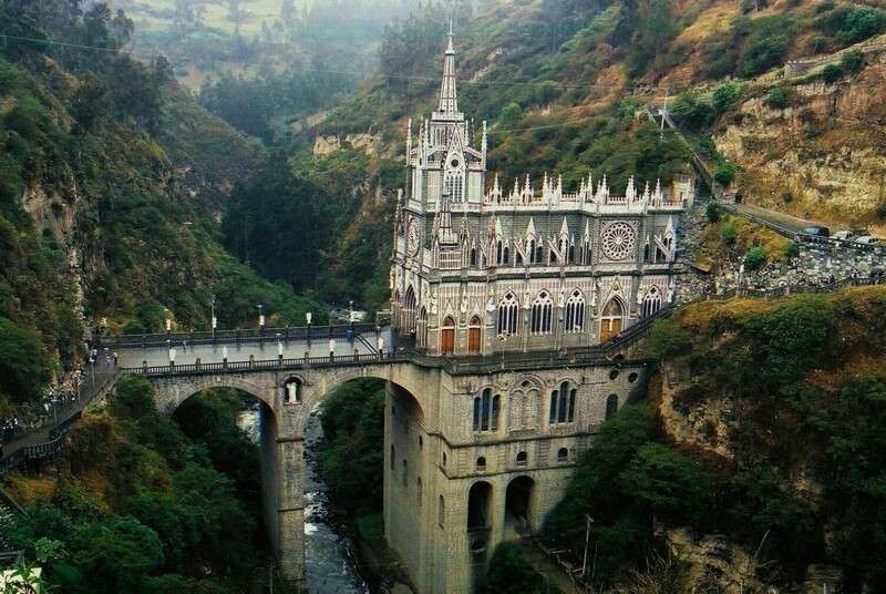 Базилика Лас-Лахас расположена в каньоне на границе Колумбии и Эквадора. Невероятная архитектура в стиле готического возрождения и интерьеры действительно завораживают, не в последнюю очередь потому, что само здание возвышается над рекой на высоте 45 метров, среди скал и водопадов.