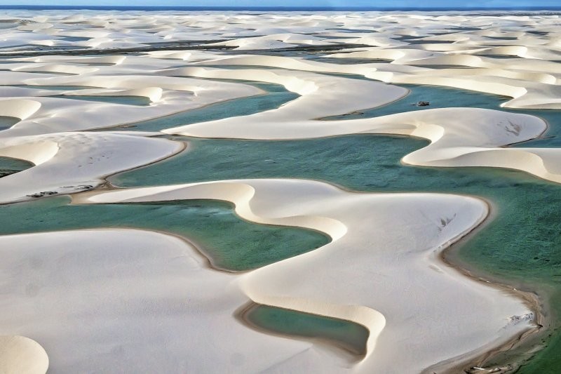 Национальный парк Ленсойс-Мараньенсес получил название «Мараньяновы простыни». Он расположен у побережья Атлантического океана на северо-востоке Бразилии. В сезон дождей это становится чем-то просто незабываемым. Каждый год в этот период среди песчаных дюн образуются тысячи лагун с бирюзовой водой и различными морскими обитателями. Остается загадкой, как после засухи рыба и крабы попадают сюда, но масштаб зрелища такого масштаба не может не удивлять. Лучшее время для посещения - с июля по сентябрь, когда бассейны достигают максимального объема.