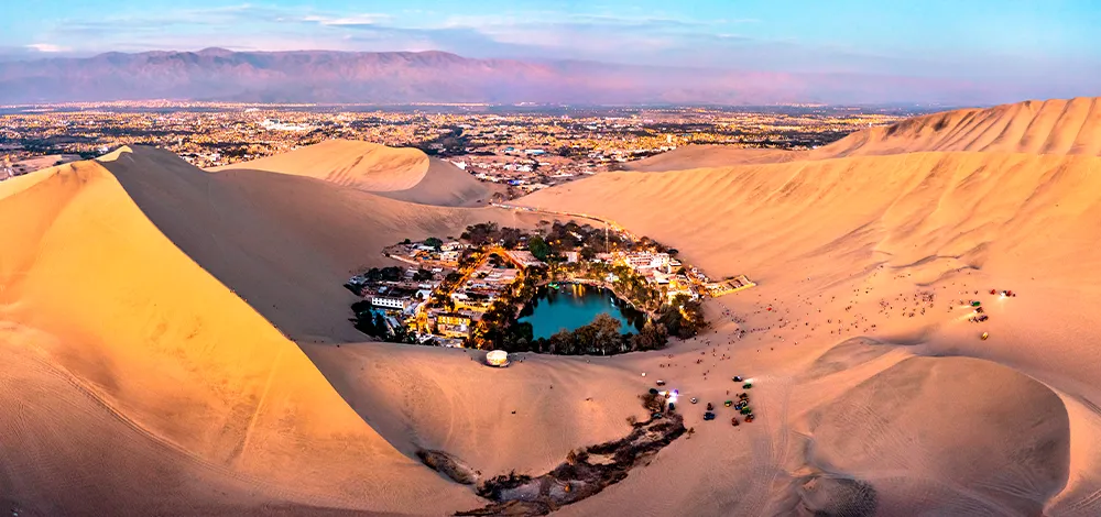 Уакачина - город-оазис посреди обширной пустыни. Чтобы добраться туда, понадобится около пяти часов по дороге к югу от столицы Перу Лимы. Население составляет всего 200 человек, поэтому по прибытии гости почувствуют себя полностью отрезанными от мира. Кроме того здесь можно покататься на сэндбординге по песчаным перуанским холмам.