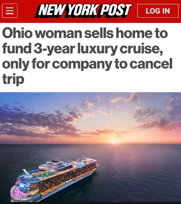 «Женщина из Огайо продала свой дом, чтобы отправиться в незабываемый круиз, который обошелся ей в 32 000 долларов. Однако мечта за три года обогнуть земной шар с остановками в 148 странах не сбылась — рейс отменили.
