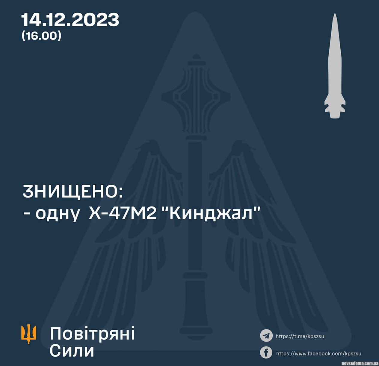- рф ударила по Украине тремя ракетами «Кинжал», – ПС.
