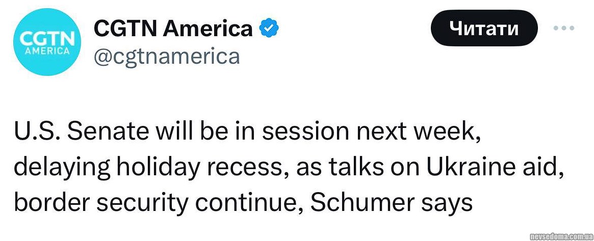 - Сенат США отложил праздничные каникулы, поскольку переговоры о помощи Украине и безопасности границ продолжаются, — CGTN America со ссылкой на лидера демократов Шумера.
