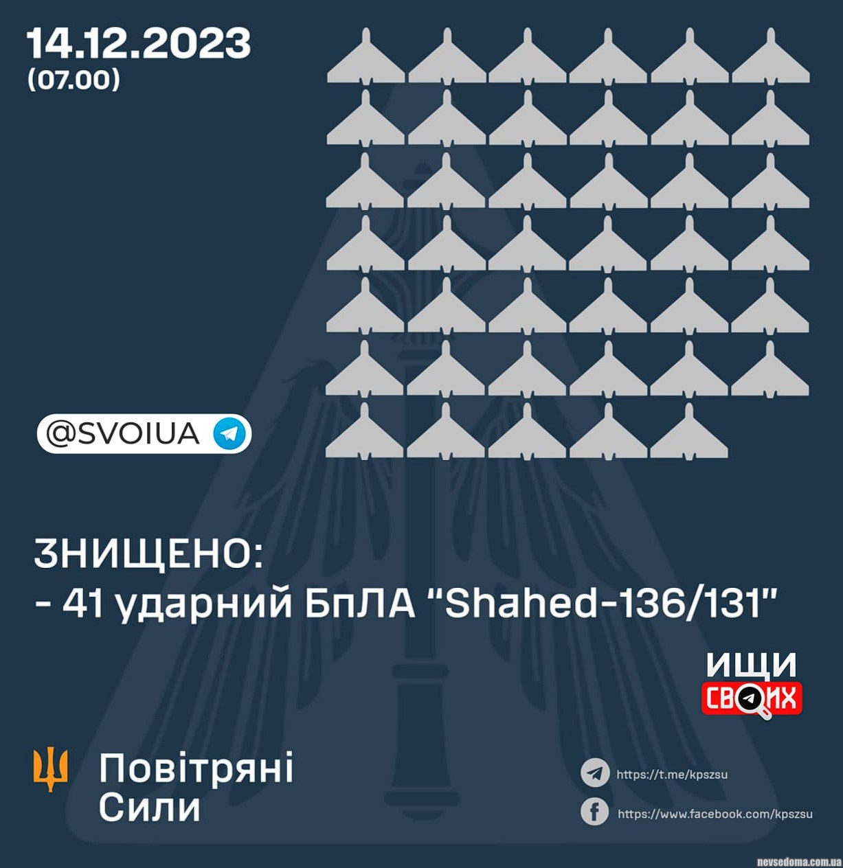 Боевые БПЛА "Shahed-136/131" начали атаковать с 19:00 13 декабря. Их запуски происходили волнами в трех направлениях: Балаклава, Чауда – Крым и Приморско-Ахтарск – рф. Всего было зафиксировано 42 запуска вражеских ударных БПЛА.