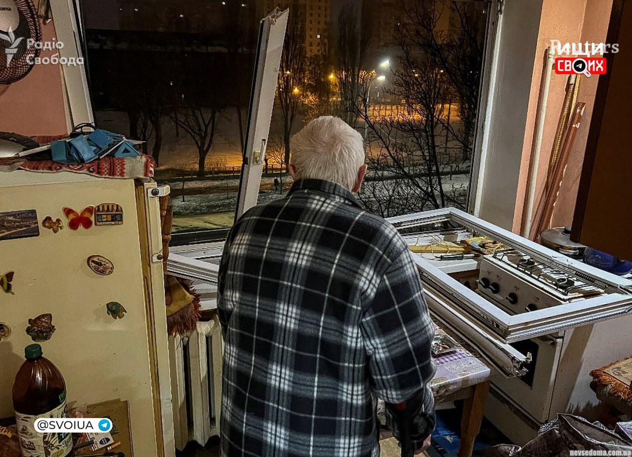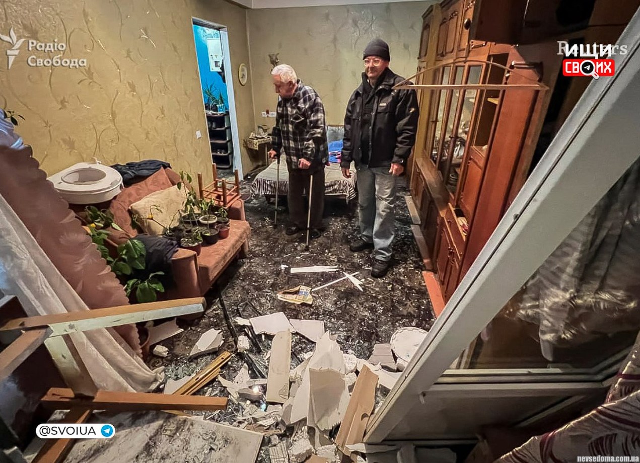 На первых фото - 71-летний мужчина смотрит на свою повреждённую квартиру, на других - местные жители и последствия.