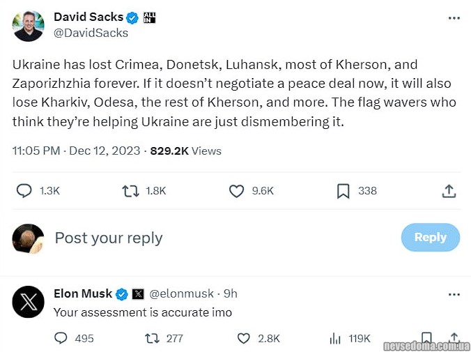 «Украина навсегда потеряла Крым, Донецк, Луганск, большую часть Херсона и Запорожье. Если она не заключит мирное соглашение сейчас, она также потеряет Харьков, Одессу, остальную часть Херсона и многое другое. Флаг колеблется, кто думает они помогают Украине, просто расчленяют ее».