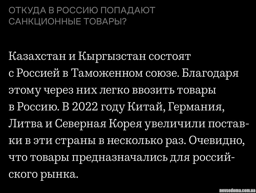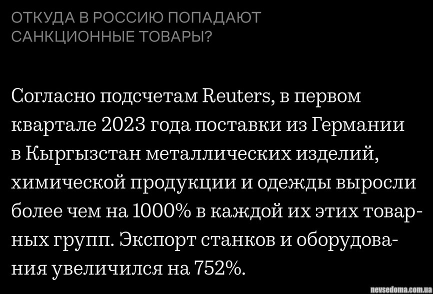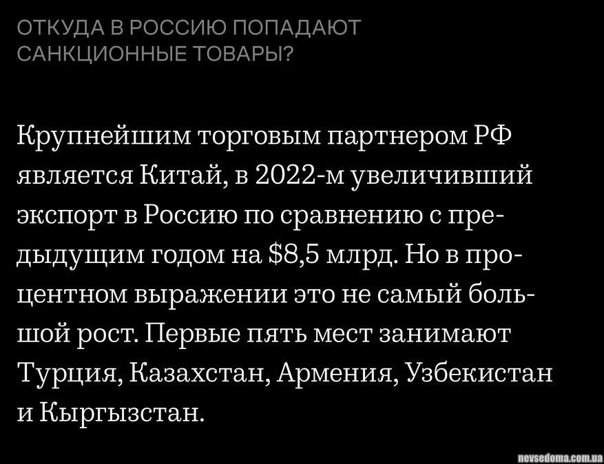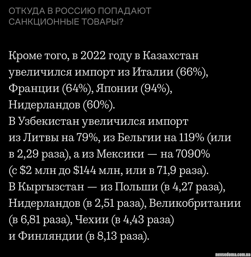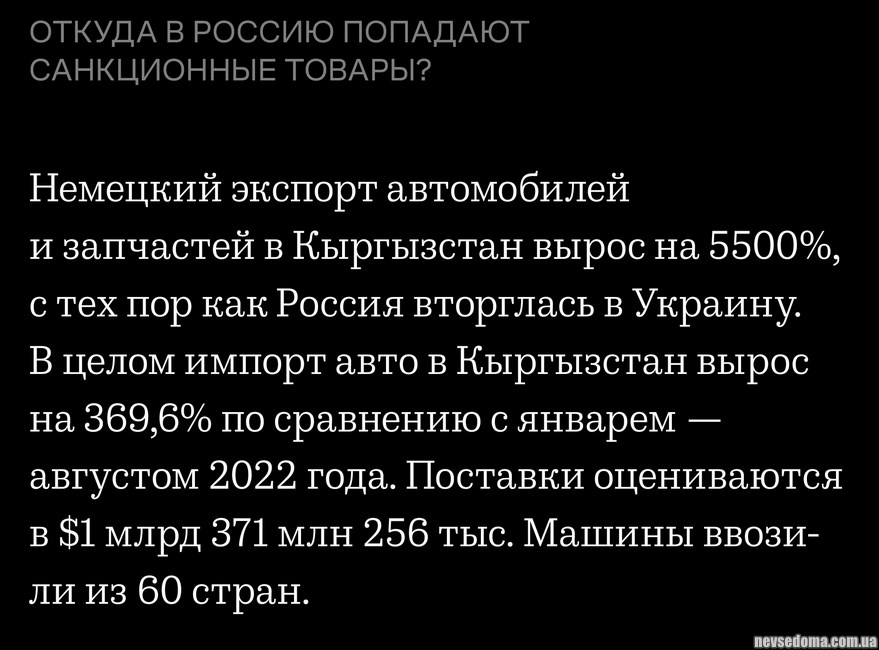 - В Узбекистан импорт из Литвы увеличился на 79%, из Бельгии на 119%, а из Мексики — на 7090% (!). В Кыргызстан импорт немецких автомобилей и запчастей вырос на 5500%. Общий объем «параллельного импорта» в Россию в 2022 году превысил $20 млрд.