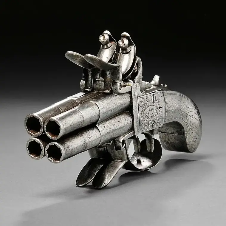 Четыре нарезных ствола - значительное новшество - свидетельствуют о том, что пистолет был нацелен на повышение точности стрельбы, что было одним из ключевых достижений в огнестрельном оружии того времени. При общей длине около 18 см это компактное оружие было создано для удобства ношения, вероятно, в качестве личного боевого оружия. Стоит также отметить красивый узор на рукоятке.